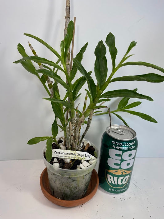 Compact Dendrobium Nobile Angel Baby Orchid established and potted - not in bloom. White blooms with a yellow throat!