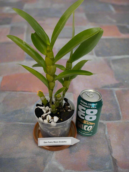 Dendrobium Fairy Moon 'Sweetie' Orchid in a 4 inch pot. The flowers are yellow with a pink picotee and deep yellow throat.
