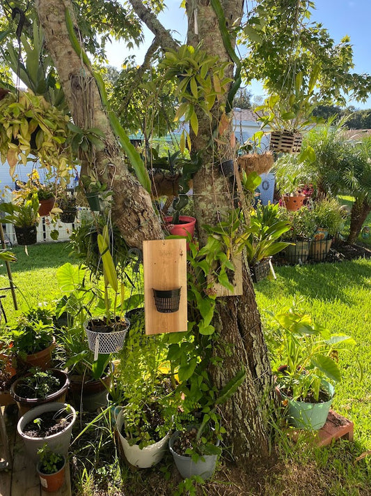 Handmade indoor/outdoor Orchid mount kit on a cedar shingle with a 5-inch mesh pot.