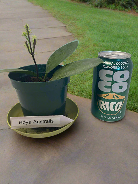 Hoya Australis potted and established - not in bloom. Known for its rounded, oval-shaped leaves, long climbing vines, and fragrant white flowers.
