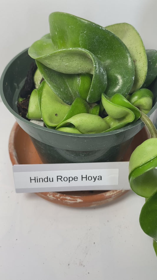 Hindu Rope Hoya potted and established. Clusters of light-pink flowers with a delicious mocha-scent.