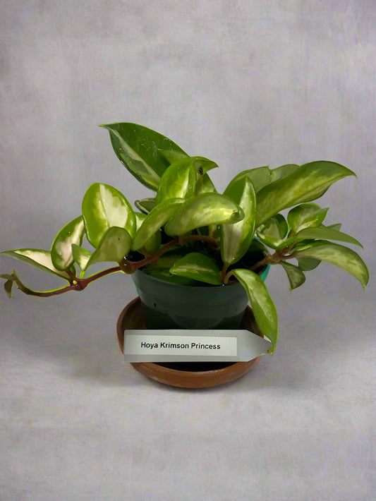 Hoya Krimson Princess established in a 4-inch pot. The leaves are waxy and will trail down elegantly or can be staked on a trellis.