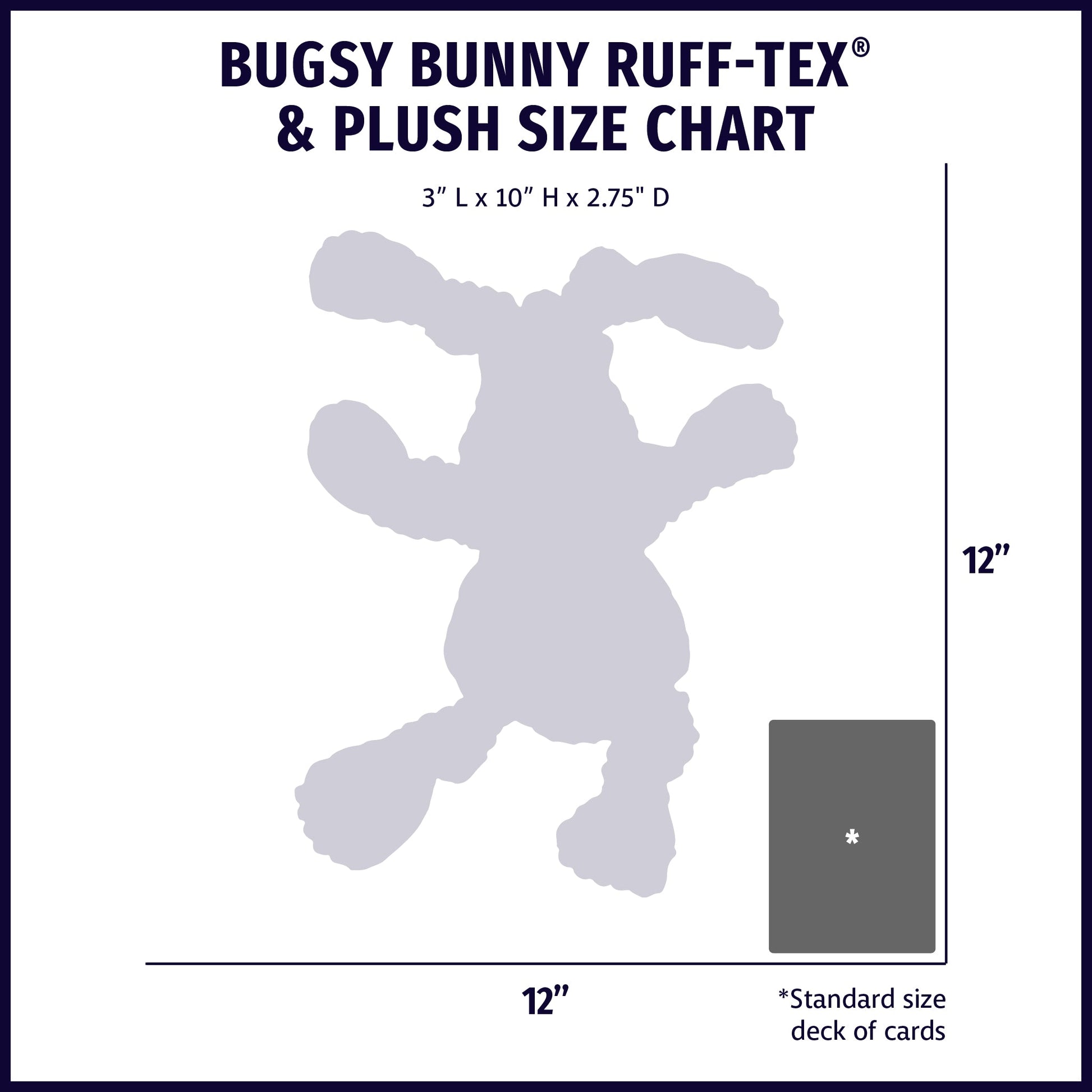 One size—Bugsy is approximately 10" tall, including plush ears and legs. (The Ruff-Tex® body is approximately 6" tall x 3" wide x 2.75" deep.) The plush ears, as well as the plush arms and legs, pass through the body to help secure the plush limbs to the Ruff-Tex® body.