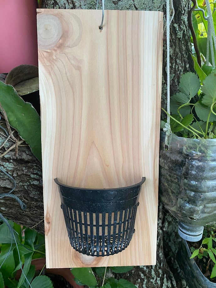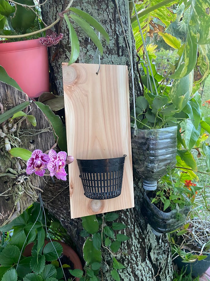 - 1 Handmade indoor/outdoor Orchid mount kit on a cedar shingle with a 5-inch mesh pot
