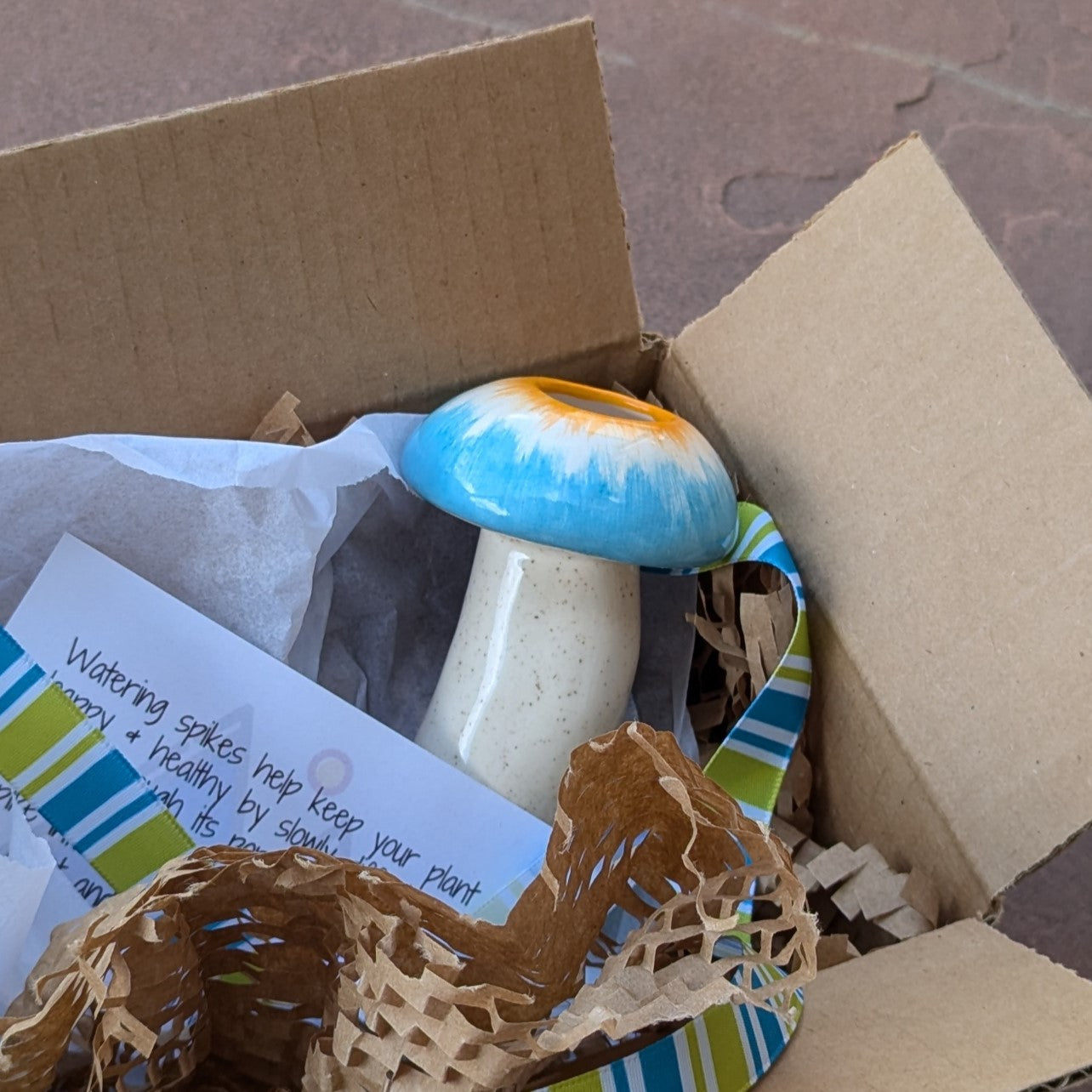This hand-crafted mushroom watering spike is available exclusively from Mountain Mudworks! Watering spikes slowly disperses water into the soil to help keep your plant well hydrated. This item is similar to a watering bulb, but better! Why? It's easy to use. Unlike the bulbs it doesn't get clogged with soil. AND it won't damage plant roots because you don't need to remove to add water, just fill the the reservoir while watering the plant and the ceramic spike will allow the water to slowly seep through to the soil for several days. Great for indoor or outdoor plants. (Do not leave out in freezing conditions)